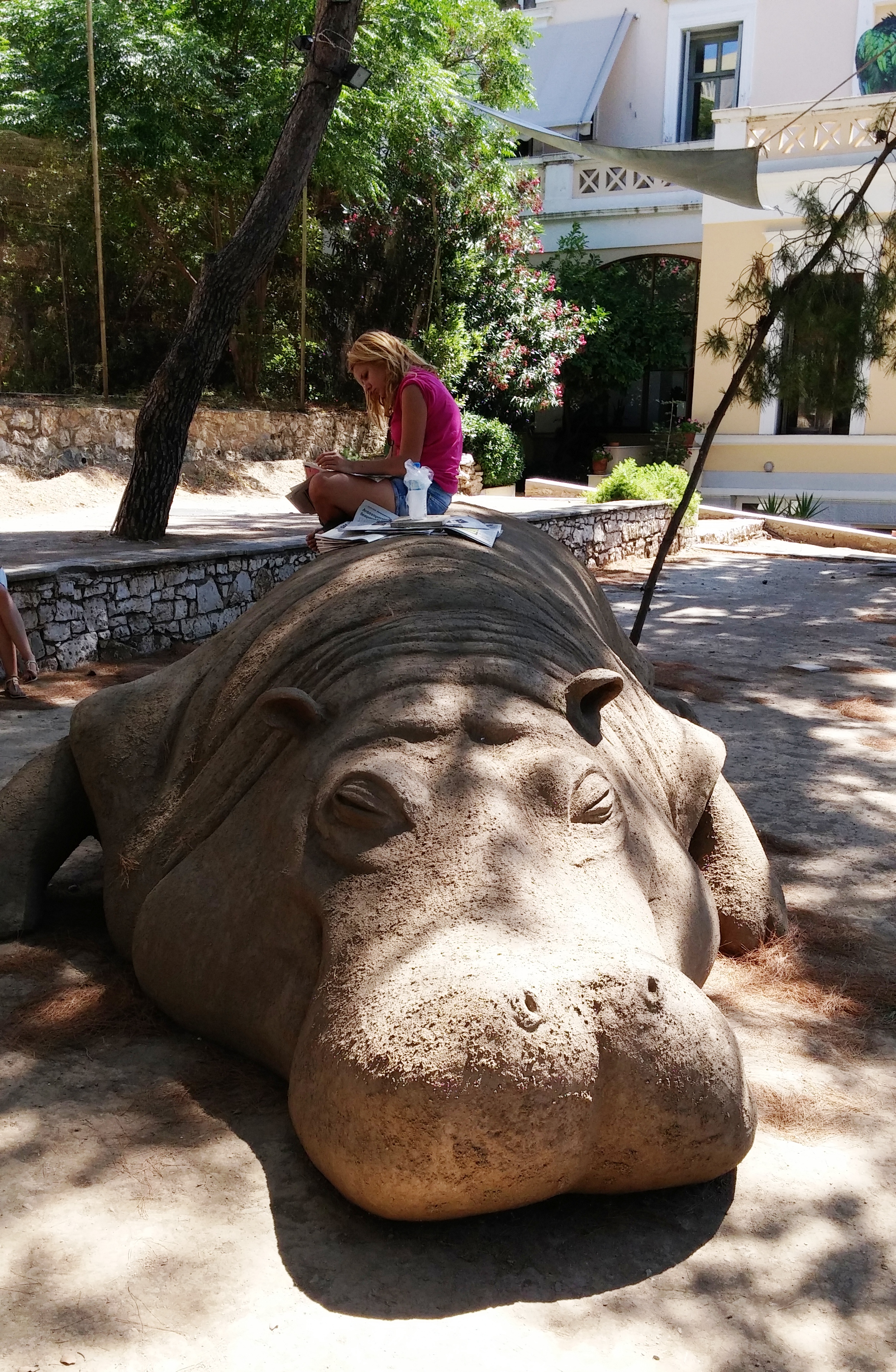 Ένα από τα έργα της έκθεσης αυτό-της εξαιρετικής Τerrapolis-που παρουσιάζει ο ΝΕΟΝ σε συνεργασία με την Whitechapel Gallery, εκεί στους Κήπους της Γαλλικής Σχολής. Κυκλώνουμε και επεξεργαζόμαστε τον πράο Ιπποπόταμο μέσα στην απογευματινή γαλήνη των Κήπων και περιμένουμε μιά κάποια στιγμή που θα κουνηθεί και θα κάνει την οδό Διδότου να τρέμει.
