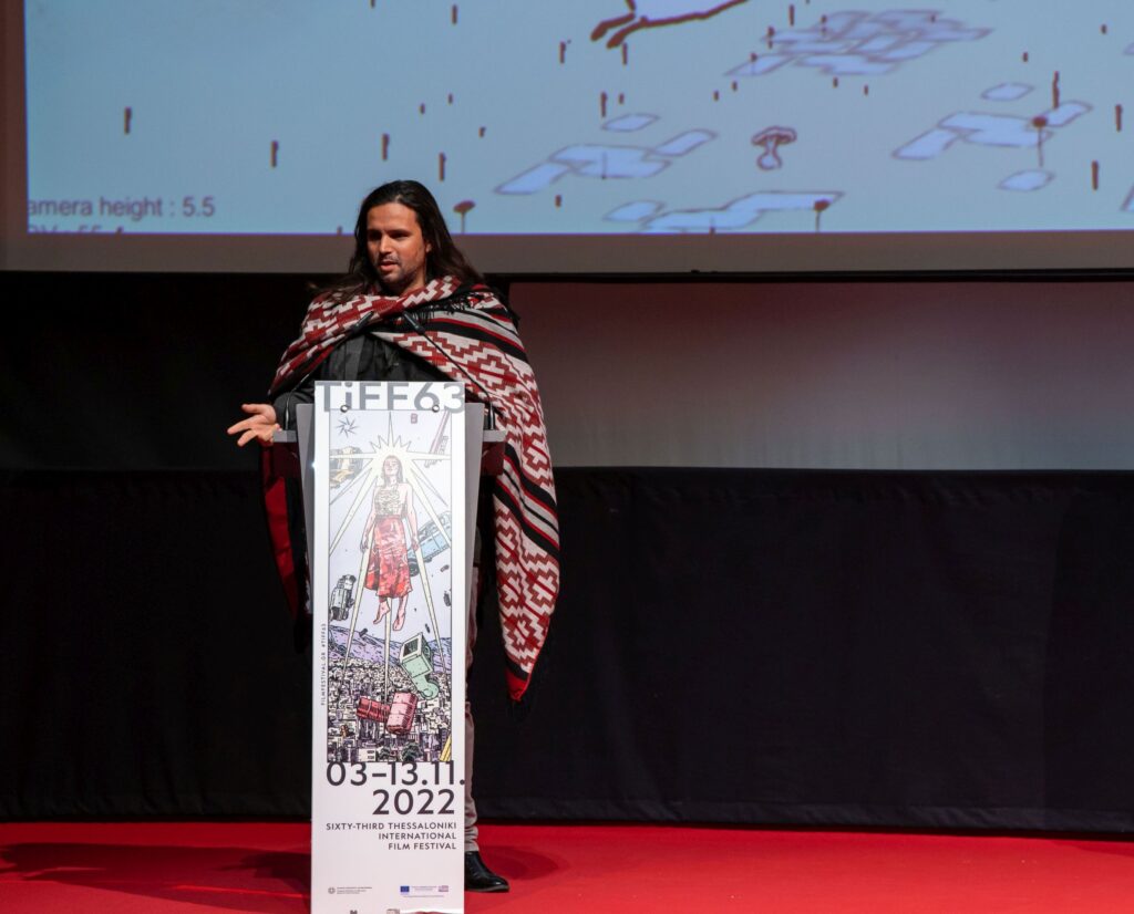 Aυτή η πλατεία κέρδισε και το βραβείο στην κατηγορία της Immersive Reality. Και ο Πέδρου ανέβηκε στη σκηνή να παραλάβει το βραβείο του φορώντας ένα πόντσο σαν εκείνα που φοράνε οι αυτόχθονες της Αμερικής και ήταν σίγουρα η εμφάνιση της βραδιάς. Και τού το ανέφερα αργότερα που τον είδα στο “Υ”, στο πάρτι και του είπα επίσης πόσο μου άρεσε και το έργο του – αλήθεια πολύ!- και μιλήσαμε λίγο για τον τόπο του ανάμεσα στη νότια Βραζιλία και την Αργεντινή – από την Αργεντινή είχε αγοράσει και το πόντσο.